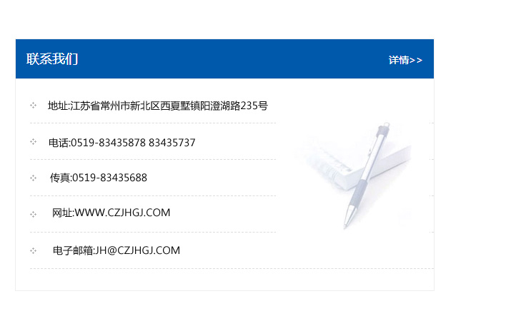 傳真:0519-83435688    郵編:213135    網址:WWW.czjhgj_com.hs-sdt.com    電子郵箱:JH@czjhgj_com.hs-sdt.com